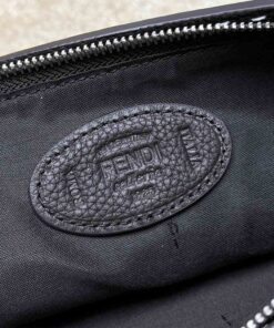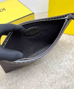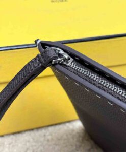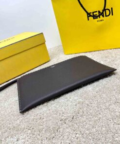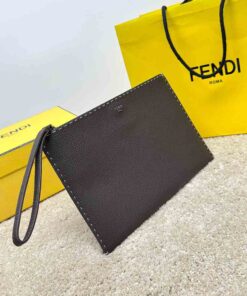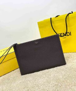 Medium-sized flat pouch with zipper. Made of dark brown Cuoio Romano leather, finished with 196 hand-sewn macro topstitches, an emblem of the iconic Selleria workmanship handed down through generations of Fendi artisans since 1925. Palladium-finish metal Fendi Roma lettering. Interior with hand-stitched Fendi Selleria leather stamp.