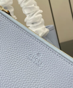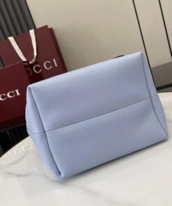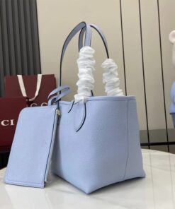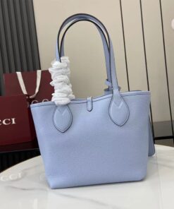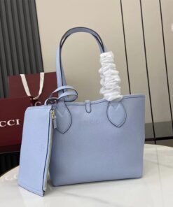 Light blue grainy leather on one side, beige and dark brown GG canvas on the other