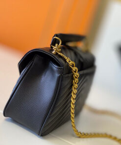 Antiqued-gold chain and black leather shoulder strap, black leather handle